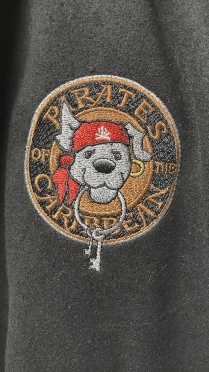 The jacket features impeccable embroidery detailing, showcasing some of the finest craftsmanship ever seen from this artist. The scene depicted is the iconic moment towards the end of the Pirates of the Caribbean attraction, where the city is in flames, and three pirates attempt to lure the dog holding the key to their cell. Even in death, the pirates' ghostly forms persist in their quest to free themselves, with spectral gestures that materialize and fade as they beckon the dog. This unforgettable scene is brought to life with vibrant fiber optic elements, with stunning illuminated fire details in the torch and an additional glowing element on the front left chest.