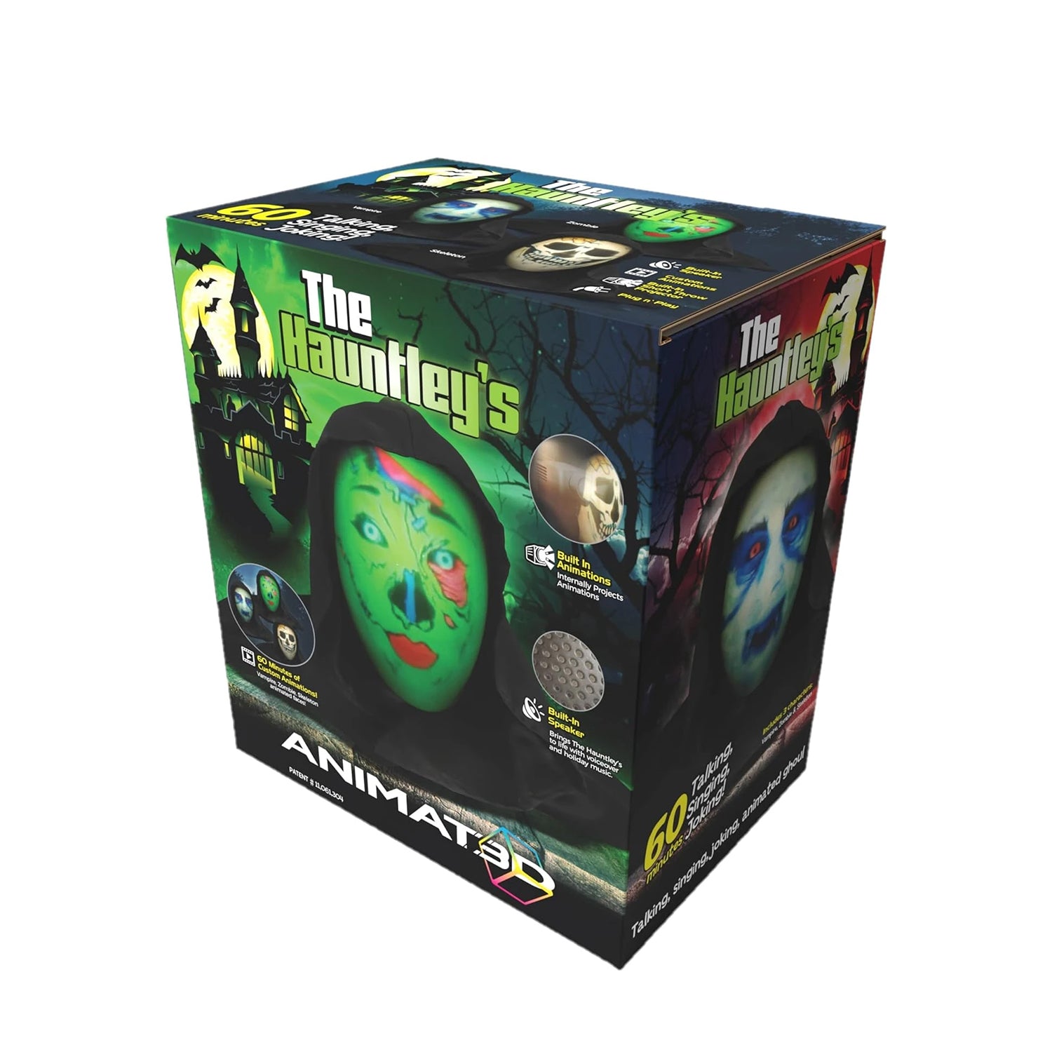 - The Hauntley’s is an indoor or covered outdoor porch talking haunted head that provides over 60 minuets of animations, with each unique character (Zombie, Skeleton and Vampire) Singing, Talking and Joking!