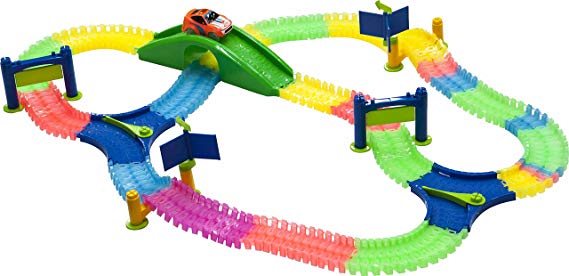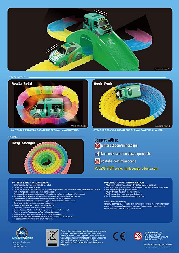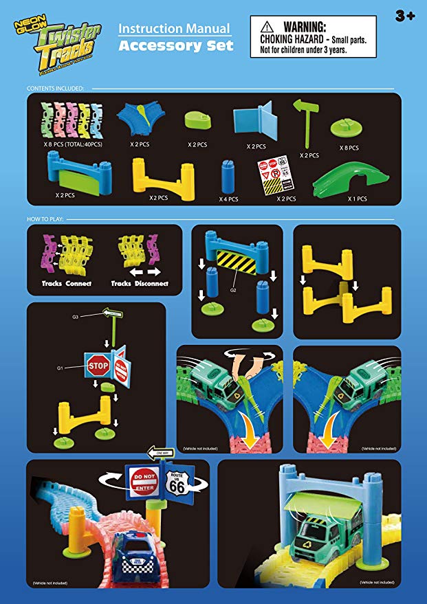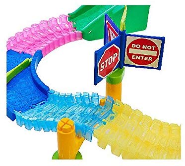 - Includes 2'L glow-in-the-dark track, two splitters, two doors, two rotating signs, bridge/tunnel piece, and two sheets of stickers