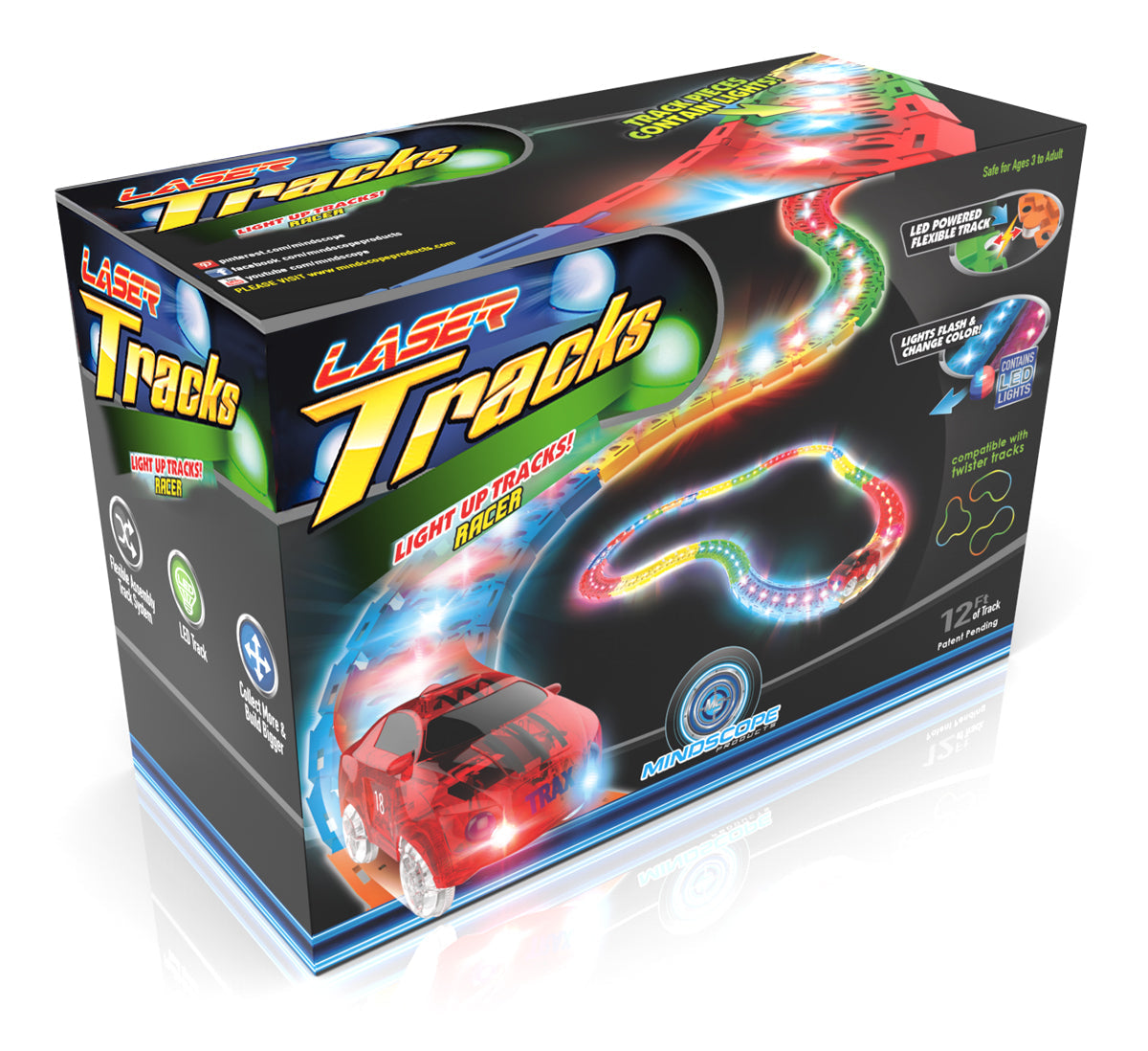 - LASER TWISTER TRACKS, LED lights added to each individual track piece! 8 feet of flexible LED track + 4 feet of standard flexible track. LED Track Power Base requires 2 AAA batteries (not included)