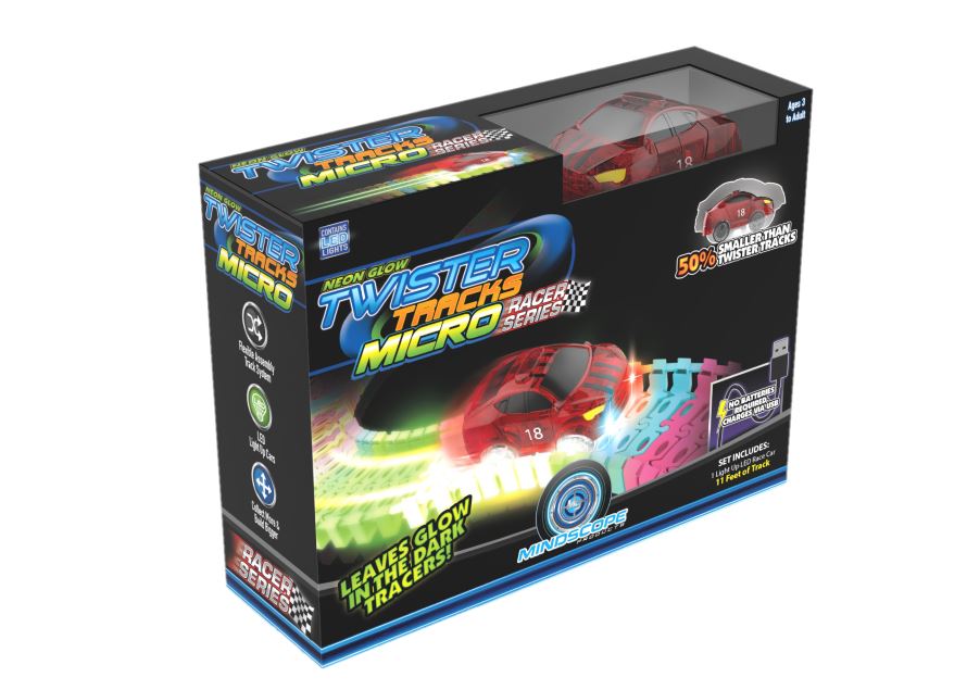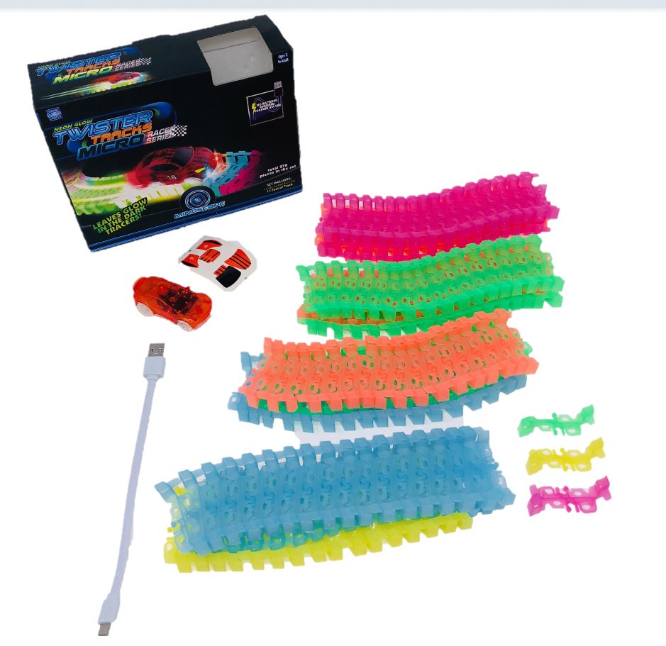 - Micro Series is half the size of the standard Twister Tracks and Includes 11 feet of neon glow in the dark flexible assembly track.