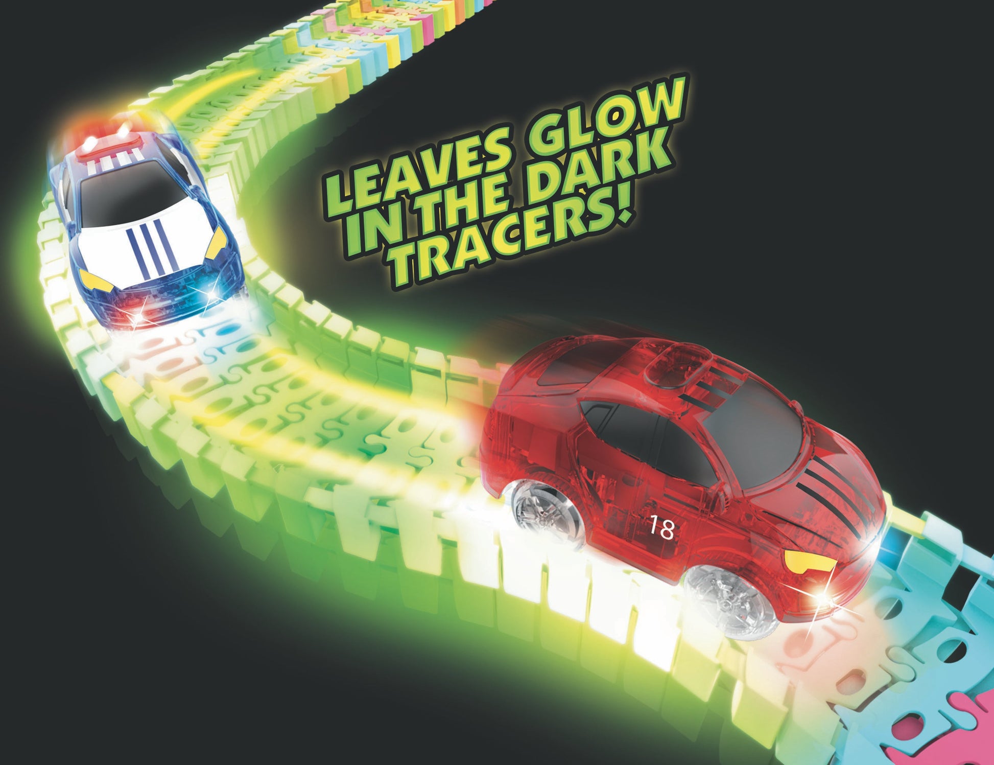 - Race Car has black lights underneath that leaves a glow in the dark trail on the neon glow in the dark flexible track.
